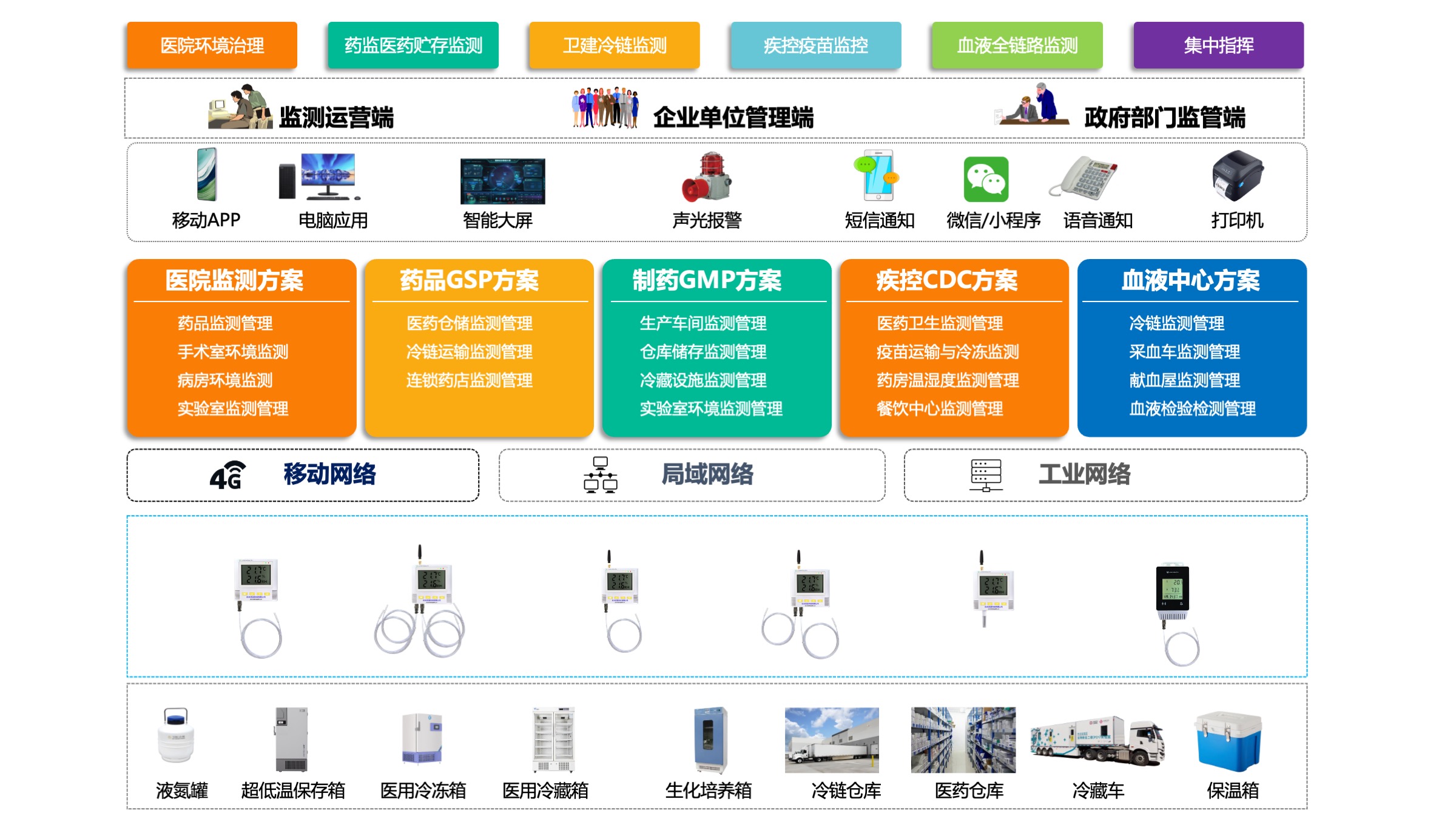 严格遵守GSP、GMP、JCP、CDC等法规要求,为医疗、医药、卫生、防疫等行业,提供“贮存监测+智慧物联”解决方案, 对干细胞、基因样本、医疗器械、血液、药品、疫苗、生物样本等的恒温存储、运输、使用环节,提供从极低温 (-200℃),到极高温(200℃)的智能物联监测产品,方便适用于超低温液氮、超低温冰箱、阴凉/冷藏药品柜、冷 藏/冷冻库、高温灭菌环境、恒温箱,车载冷链等环境。 产品方案提供了4G、局域网、工业485等网络的接入方式,提供了适配于-200℃ ~200℃宽温度范围的多款型测温探头, 自带大屏幕,可在线监测、可离线记录、可票据打印,多款型设备。